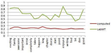 The idea behind the following implementation is that of extending the labMT word set (or, to be more precise, of word-sentiment pairs) using assessment of sentiment for online book reviews. The labMT data set containes a rather limited set of words (the most common ones), so extending it artificially (especially in relation to more domain-specific words) in interesting to analyze. The method proposed here, although improvable and flexible (different ways of computing the sentiment can be utilized), aims at obtaining sentiment ratings for new words, as a function of the review rating, the sentiment of the known words and a correlation function between rating and known sentiment.